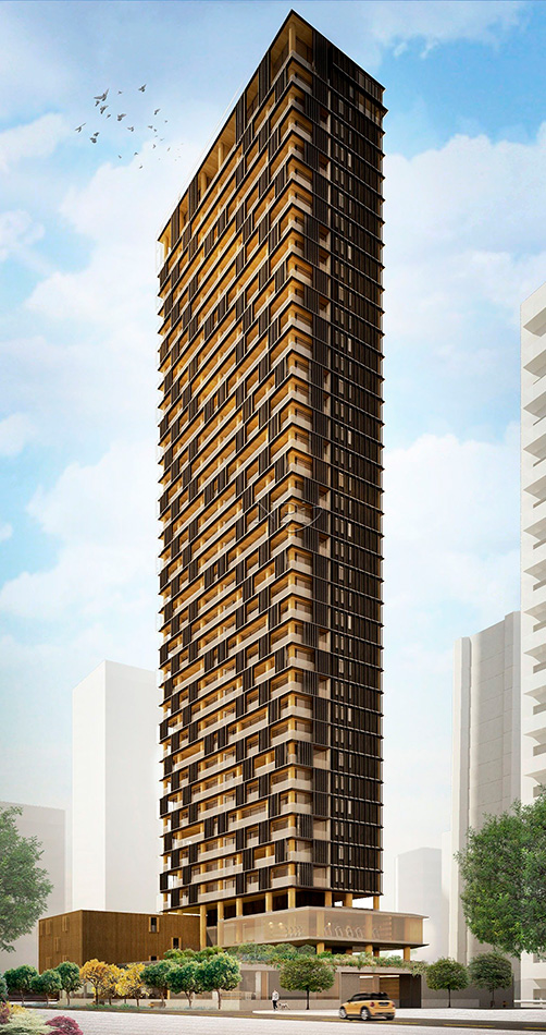 A enorme torre vertical de 41 andares abriga tanto o edifício residencial quanto o hotel, sem criar qualquer tipo de conexão interna entre eles. O projeto foi pensado em volumes independentes, “encaixados”, revelando e impondo as diversas funções do empreendimento, nas palavras de Arthur Casas, a fachada foi pensada para ser discreta, mas imponente, atemporal e sem excessos para assim não gerar incomodo na paisagem urbana da cidade, os brises metálicos que a compõem definem a estética do edifício e garantem privacidade aos apartamentos, sem prejudicar a entrada de luz e ventilação naturais. eles são movimentados pelos moradores, criando dinamismo e vivacidade para a fachada. o edifício pode ser apreciado pelas quatro laterais por conta de sua altura, acima da média do entorno.